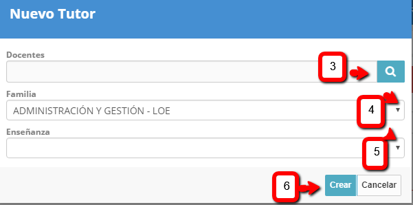 - En la ficha de Nuevo Tutor, introduzca el nombre o pulse el botón del buscador (3) y aparecerán todos. Una vez seleccionado, abrir la ventana de Familia (4) y Enseñanza (5). Finalmente Crear (6).