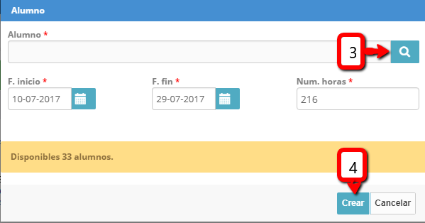 - En la ventana de Alumnos pulsar el buscador (3), aparecerá todo el listado, seleccionar y Crear (4). Así sucesivamente todos los alumnos que vayan a realizar ese Programa.