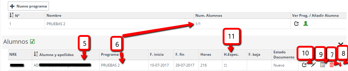 - En el apartado de Alumnos irá apareciendo el listado con el nombre del alumno (5), su programa (6), periodo, etc.
