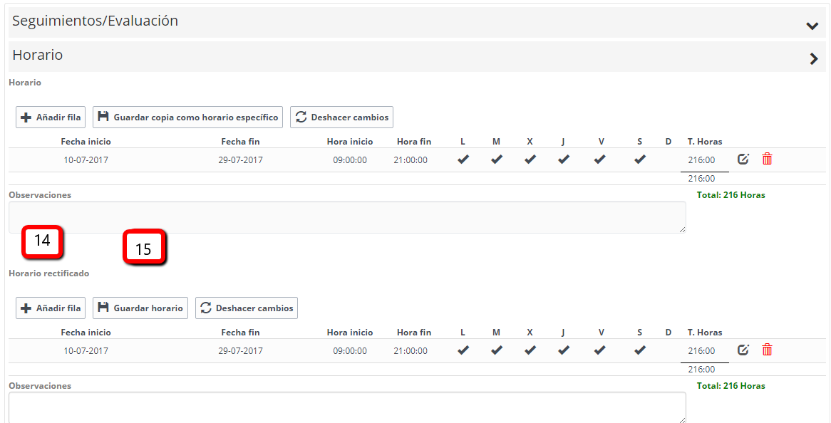 - Una vez firmado el Programa se podría hacer un horario rectificado para el alumno, en el supuesto que fuera un horario adaptado para este alumno (14) y siempre guardar (15).