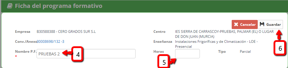 - Editar (3) para modificar, en su caso, las horas (5) y guardar (6).