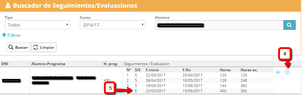 - Aparecerá el listado de seguimientos y evaluación. Al pulsar (4 - 6) se creará una evaluación, con su número, periodo y horas (5).