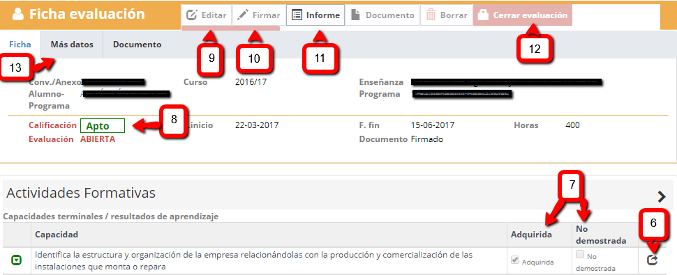 - Una vez revisadas todas las capacidades se evalúa con APTO o No APTO (8). En la pestaña Más Datos hay una casilla para observaciones al alumno (13).
