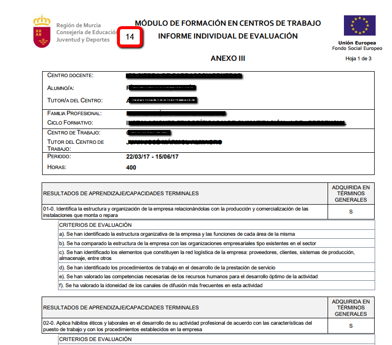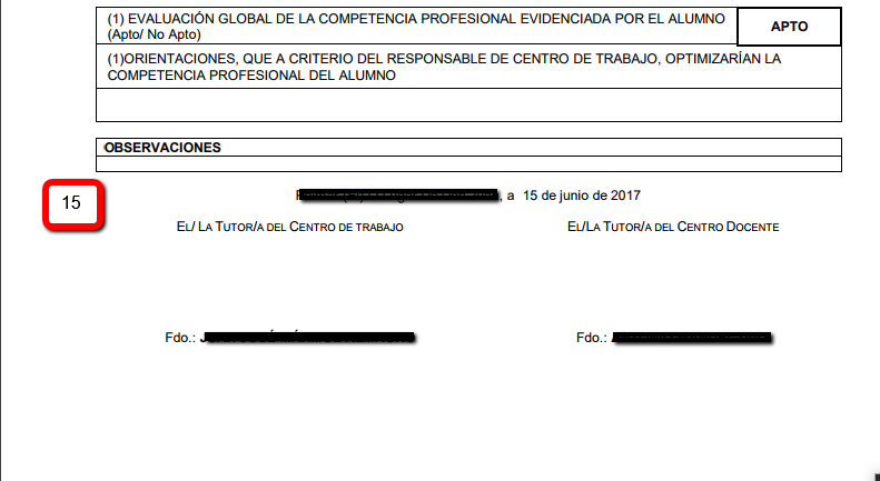 - Realizada la evaluación se puede firmar (10). Se emite un informe (11) para imprimirlo y pasarlo a la firma del tutor de empresa (15). Por último cerrar evaluación (12).