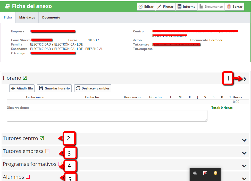 En la FICHA DEL ANEXO para crear horario el tutor seguirá los siguientes pasos:
