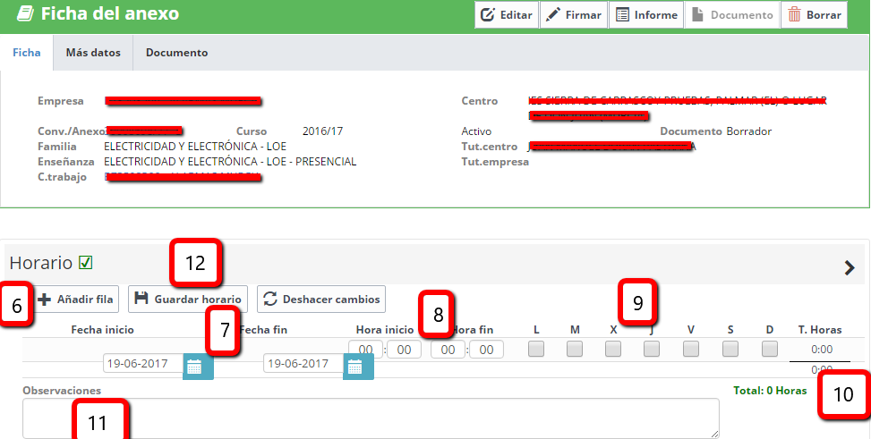- Introducir fecha de inicio y de fin de la FCT (7), así como la hora de inicio y fin de la jornada (8) y días de la semana en las que se desarrolla ese horario diario (9).