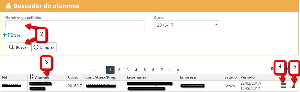 - Cuando aparece el alumno o listado, seleccione (3) el solicitado. Le permite gestionar las Tareas (4) o los Seguimientos y evaluaciones (5).
