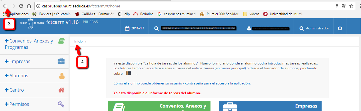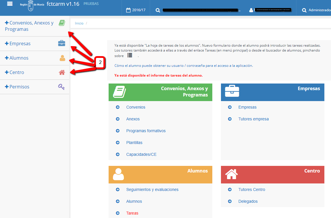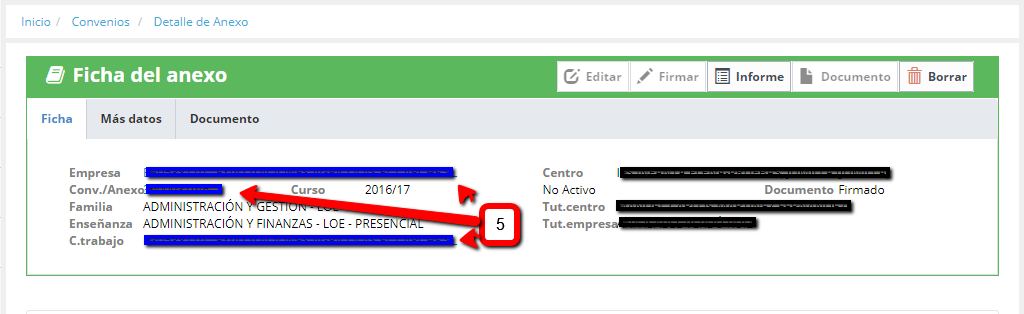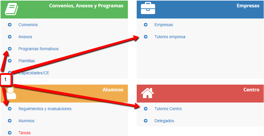 - Pulsar la pestaña de cada una de las actuaciones de las distintas ventanas (Convenios, Empresas, Alumnos, Centros) (1).