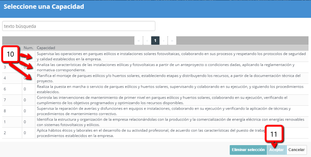 - En la ventana de la Ficha del Programa formativo despliegue el programa (8) y pulse Añadir Capacidad (9).