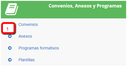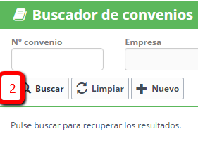 - Pasará a la pantalla del buscador de convenios Buscar (2) para comprobar los convenios que tiene el centro.