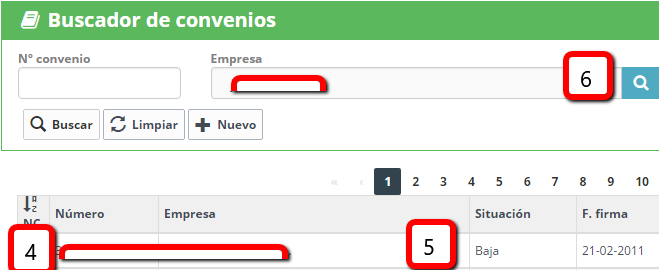 - Si no hay ningún convenio vigente pulse el botón del buscador de empresas (6).