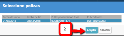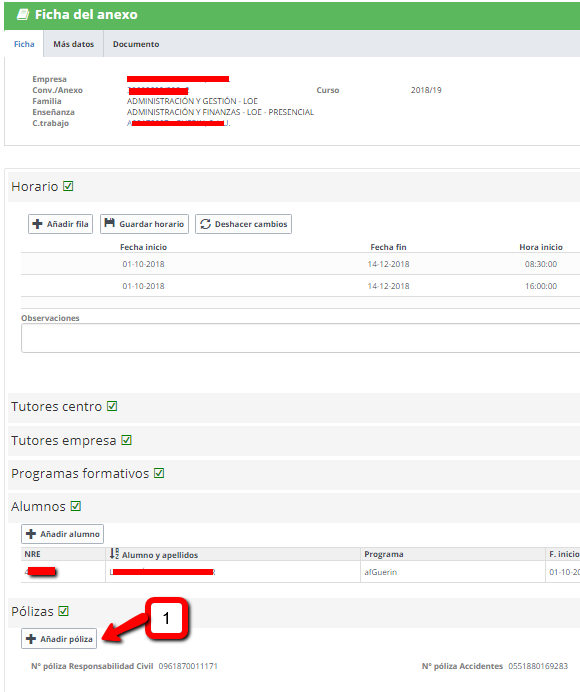 La Consejería competente en materia de Educación tiene suscritas pólizas de seguros de Responsabilidad Civil y Accidentes (1), complementarias al Seguro Escolar, para el alumnado que realiza la FCT. Estas pólizas se renuevan periódicamente por lo que es necesario seleccionar el periodo (2) en el que se va a iniciar la FCT.