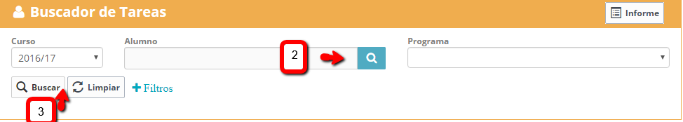 - En la ventana Buscador de Tareas, puede listar todos los alumnos (2) y seleccionar o introducir el nombre del alumno y buscar (3).