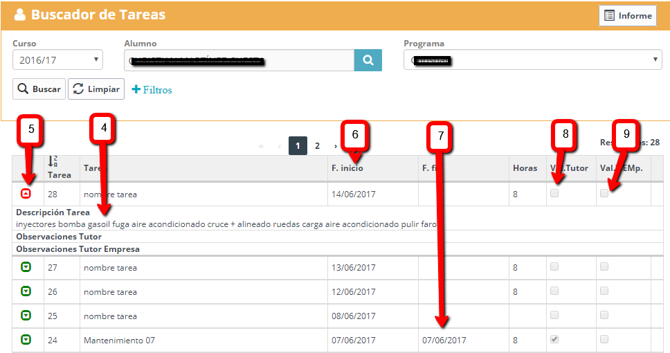 - Cuando aparece el alumno o listado, seleccione (3) el solicitado. Permite ver el listado de Tareas (4), su nombre (5), fecha de inicio (6) y de cierre (7) así como el número de horas; así como la descripción de la Tarea.
