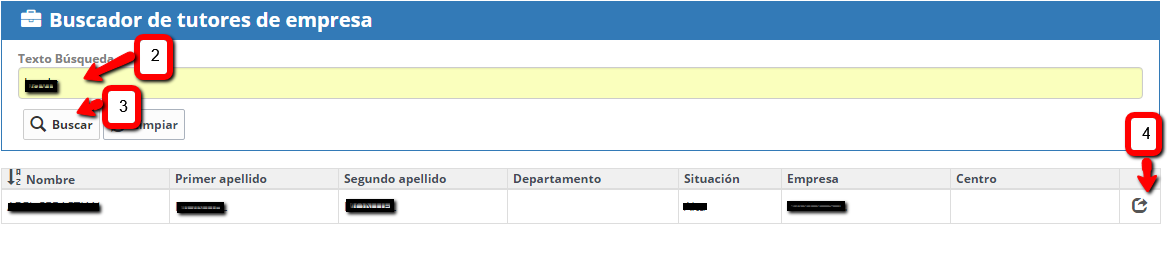 - En la ventana Buscador de tutores de empresas, puede listar todos los tutores (2) y seleccionar o introducir el nombre del tutor o empresa y buscar (3).