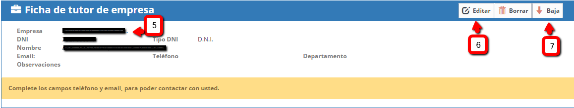 - En la ficha del tutor de empresa, puede editar para actualizar datos (6), dar de baja (7) cuando el tutor ya no pertenece a la empresa, o crear uno nuevo (5) marcando el NIF de la empresa, que actúa como enlace.